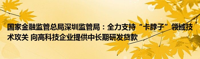 今天【国家金融监管总局深圳监管局:全力支持“卡脖子”领域技术攻关 向高科技企业提供中长期研发贷款】登上了全网热搜,那么【国家金融监管总局深圳监管局:全力支持“卡脖子”领域技术攻关 向高科技企业提供中长期研发贷款】具体的是什么情况呢,下面大家可以一起来看看具体都是怎么回事吧!