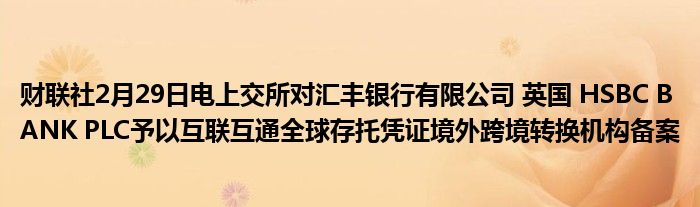 财联社2月29日电上交所对汇丰银行有限公司 英国 HSBC BANK PLC予以互联互通全球存托凭证境外跨境转换机构备案