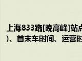 上海公交833路的线路信息如下:* 始末站:闻喜路阳泉路-军工路复兴岛公交枢纽站。这条线路共经过以下站点:闻喜路阳泉路、临汾路闻喜路等 浏览全文>>