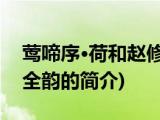 大家好,莺啼序·荷和赵修全韵,关于莺啼序·荷和赵修全韵的简介很多人还不知道,现在让我们一起来看看吧! 1、《莺啼序·荷和赵修全韵》是 浏览全文>>