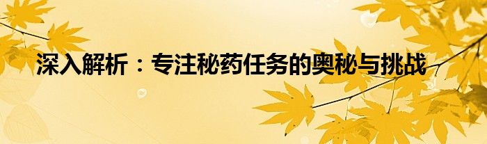 本文将全面解析“专注秘药任务”这一主题,涵盖其背后的原理、任务流程、所面临的挑战以及解决策略等方面。随着众多角色在游戏中追求特殊能力的秘药,或寻找现实世界潜在秘药的探险者,该任务愈发受到广泛关注。接下来让我们一探究竟。