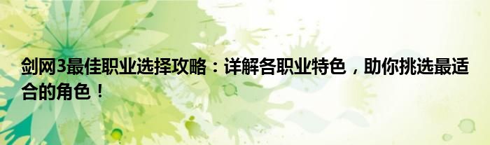 在选择职业时,玩家应根据自己的游戏喜好、战斗风格以及个人兴趣进行选择。每个职业都有其独特的特色与玩法,选择最适合自己的职业能够更好地享受游戏带来的乐趣。希望本文的介绍能够帮助新手玩家更好地选择职业,开启《剑网3》的武侠之旅!