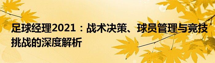 本文将全面解析《足球经理2021》这一备受瞩目的足球模拟经营游戏的核心要素,从战术决策、球员管理到竞技挑战等方面进行深入探讨。对于足球爱好者以及游戏玩家来说,了解游戏中的精髓与策略,将有助于提高游戏水平,体验更加真实的足球世界。