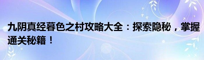 九阴真经暮色之村攻略大全:探索隐秘,掌握通关秘籍!