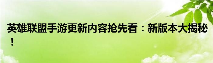 亲爱的英雄联盟手游玩家们,好消息!备受期待的英雄联盟手游新版本即将更新,本文将为你带来更新内容的抢先看,带你探索新版本的大揭秘!