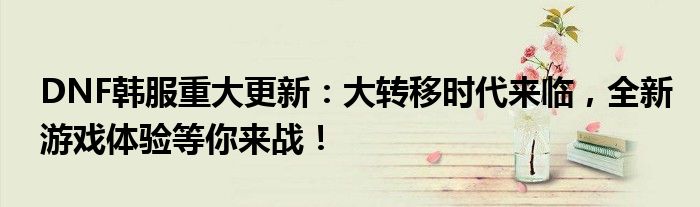 尊敬的DNF玩家们,一个令人振奋的消息传来!DNF韩服最近进行了重大更新,正式迎来了“大转移”时代。这一更新将带给玩家们全新的游戏体验和挑战,让你重新燃起对DNF的热情!