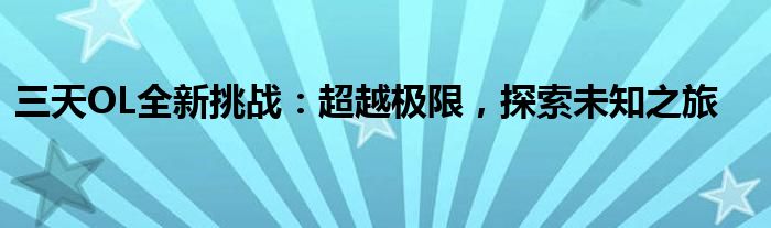 三天OL,一场充满未知与冒险的旅程即将开启。在这个充满神秘与挑战的世界里,你将面临前所未有的考验和机遇。这里不仅有丰富多彩的游戏内容,还有极具挑战性的任务等你来探索。现在就加入我们,共同踏上这趟精彩纷呈的冒险之旅吧!