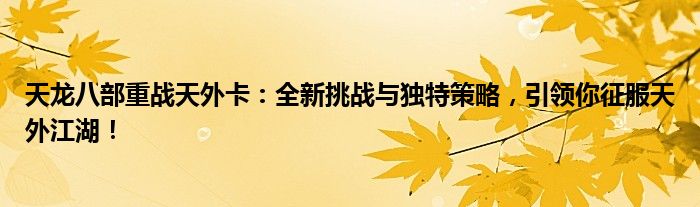 总之,《天龙八部》重战天外卡为玩家带来了全新的挑战和策略。只有不断尝试和摸索,才能在这个充满竞争和机遇的江湖中立足。快来加入重战天外卡的挑战,一起征服天外江湖吧!