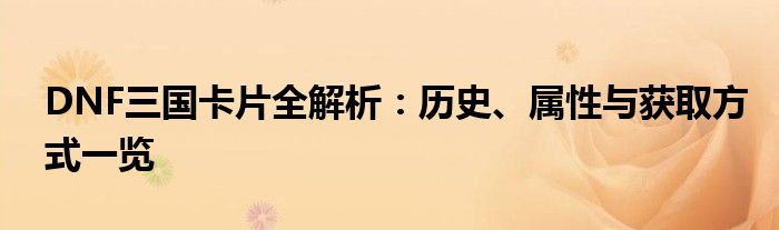 本文全面解析了DNF三国卡片的各个方面,包括历史背景、卡片属性、获取方式以及策略运用等。希望本文能够帮助玩家更好地了解和运用这些独特的游戏道具,提升角色实力,享受游戏的乐趣。