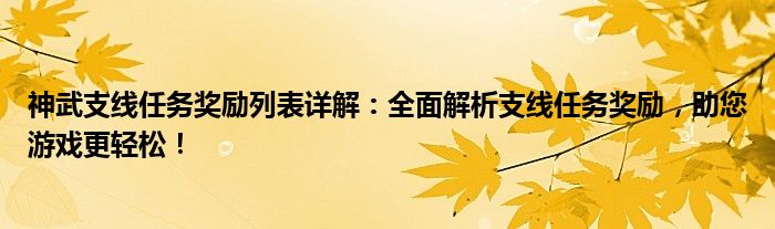 本文将为您详细介绍神武游戏中的支线任务奖励列表。通过了解这些支线任务的奖励,您将能够更好地规划游戏进程,提升游戏体验。
