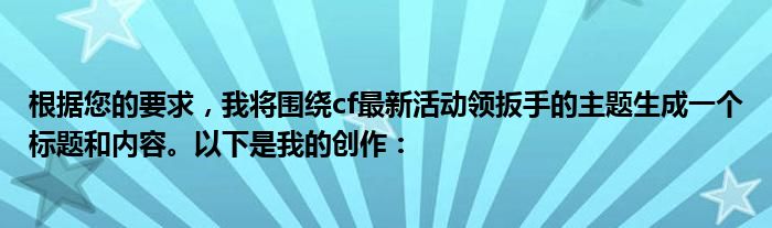 根据您的要求,我将围绕cf最新活动领扳手的主题生成一个标题和内容。以下是我的创作: