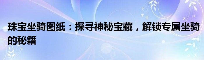 本文将详细介绍关于珠宝坐骑图纸的相关内容。通过深入探索神秘的宝藏,你将有机会获取珍贵的珠宝坐骑图纸,解锁属于你的专属坐骑。本文将为你揭示整个过程的秘密,让你轻松掌握获取珠宝坐骑的秘籍。